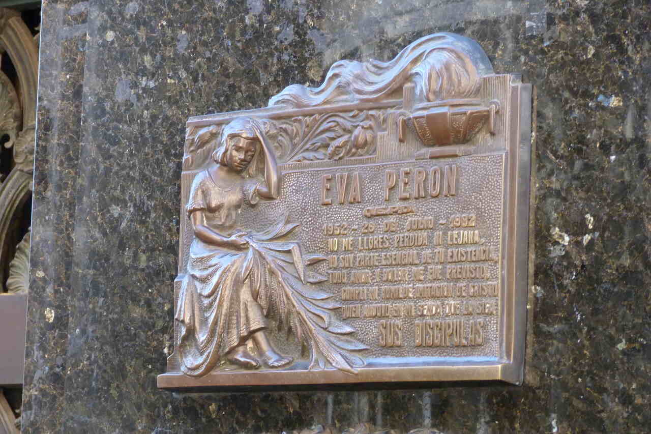 En una de las calles de la sección 16 se encuentra el panteón de la familia Duarte. De líneas art decó se destaca el tratamiento de las pilastras y el frontón que enmarca la puerta de bronce ricamente adornada con festones, flores y hojas estilizadas. La construcción está rematada por un brasero encendido, simbolizando la eternidad. Eva Duarte Perón, más conocida como Evita, desarrolló una fecunda labor social a favor de los más necesitados durante la primera presidencia de su esposo el generas Juan Domingo Perón. Murió en plena juventud y sus restos fueron depositados en este panteón junto a los suyos en 1976.